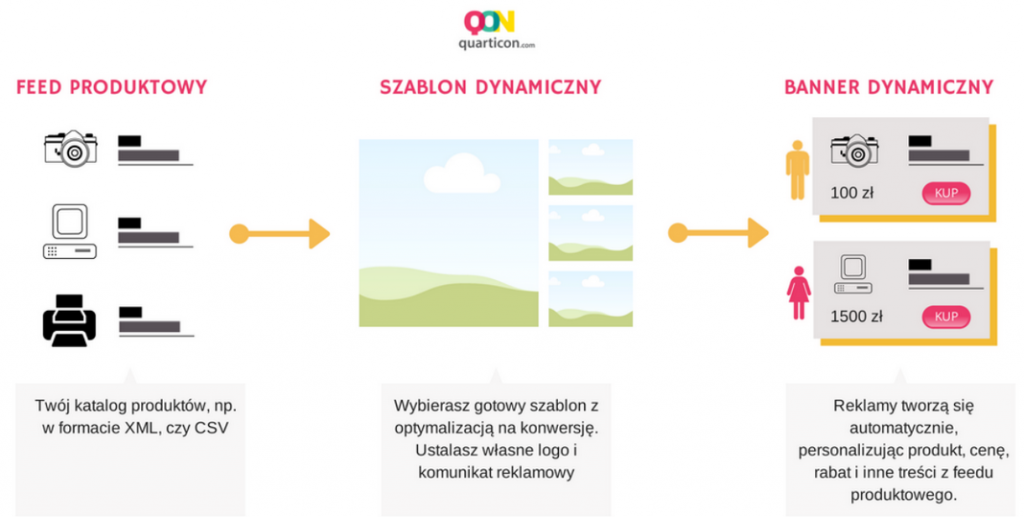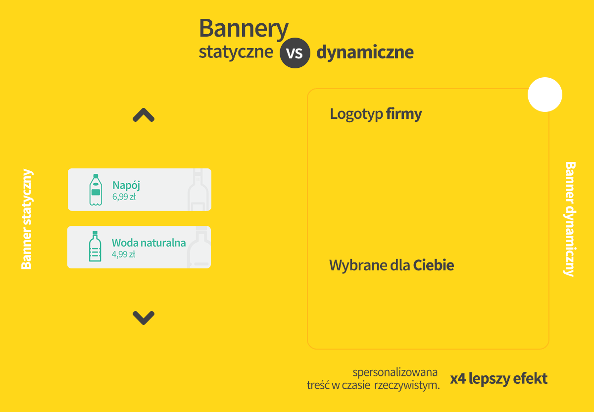 W przypadku dynamicznych bannerów kontent jest elementem, który nieustannie się zmienia. Co to znaczy? Zamiast czterech wersji bannera twórca kampanii otrzymuje niemal niezliczoną liczbę różnych treści, które wyświetlą się w zależności od tego jakie użytkownik podejmuje działania w sieci.