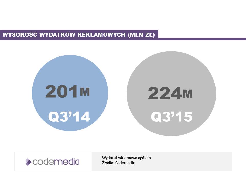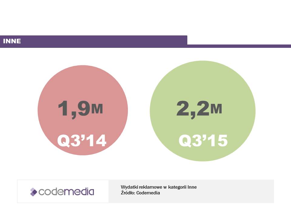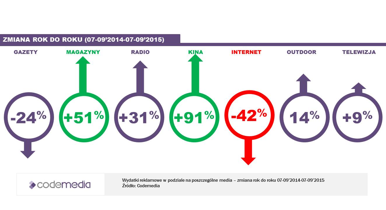 Największy wzrost zaliczyła reklama kinowa. Wydatki na nią wzrosły aż o 91% w stosunku do trzeciego kwartału 2014. W tym kanale ulokowano 8% budżetów, czyli ponad 18 milionów złotych. Natomiast na radio przeznaczono ponad 5 milionów zł, co stanowi 2% SOS.