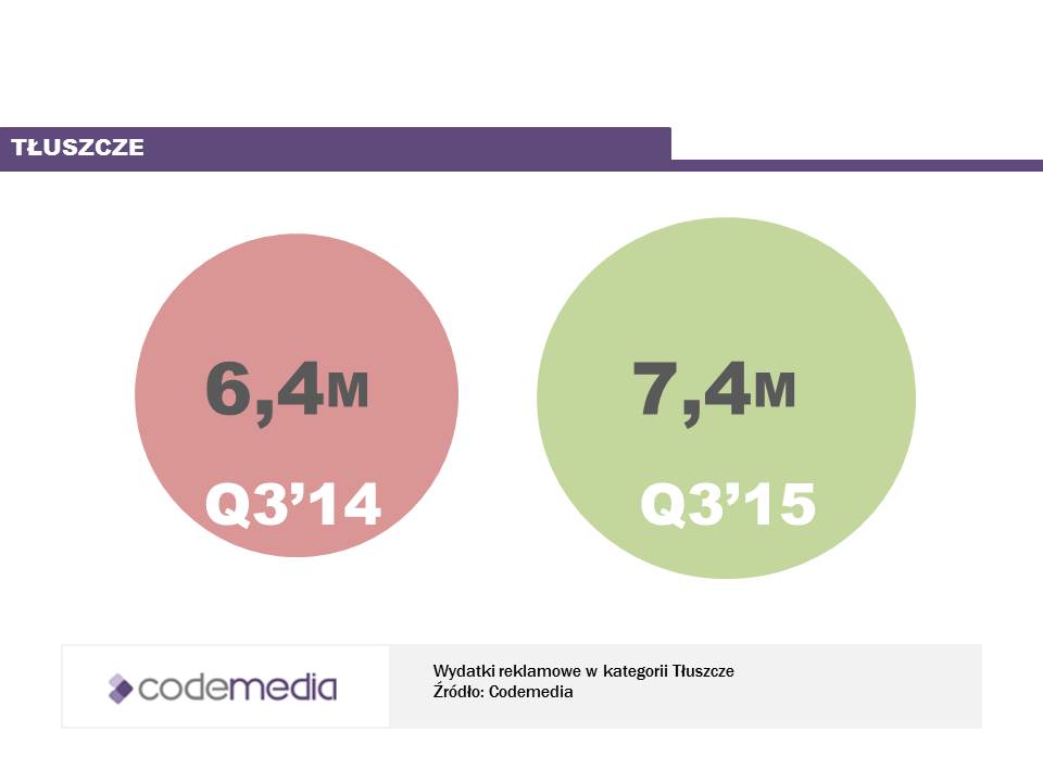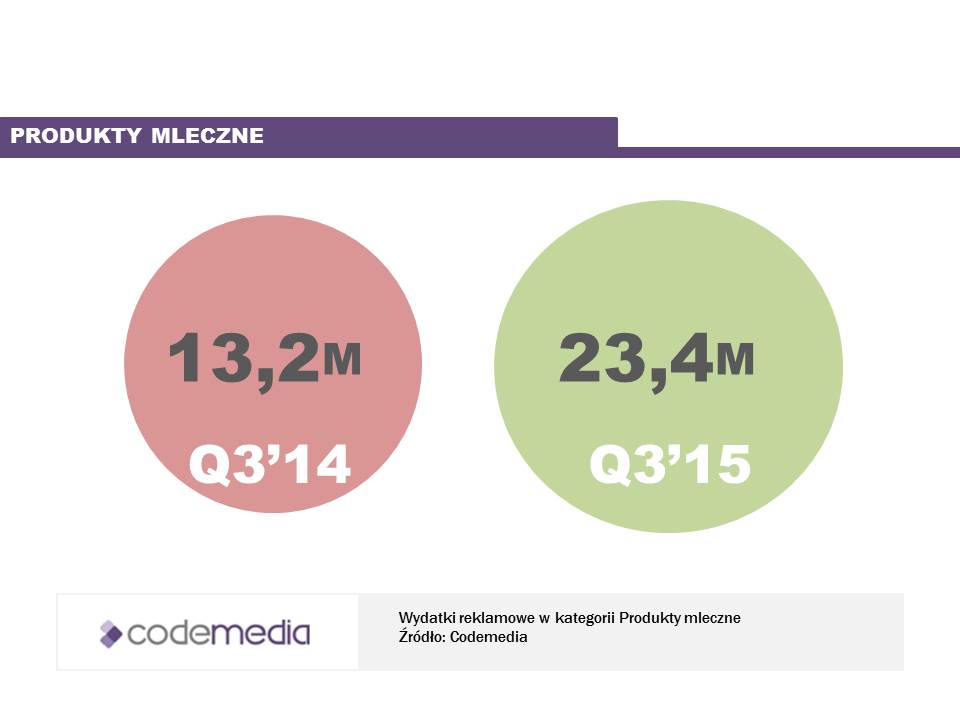 Producenci produktów mlecznych ulokowali w reklamę ponad 23 miliony złotych (10% udziału w wydatkach całej branży FMCG), notując tym samym rekordowy w tym segmencie, 77% wzrost w porównaniu do trzeciego kwartału 2014 roku. Wydatki pozostałych branż z kategorii wyniosły łącznie ponad 61 milionów złotych, a wielkość inwestycji różniła się od zeszłorocznych o kilka do kilkunastu procent.