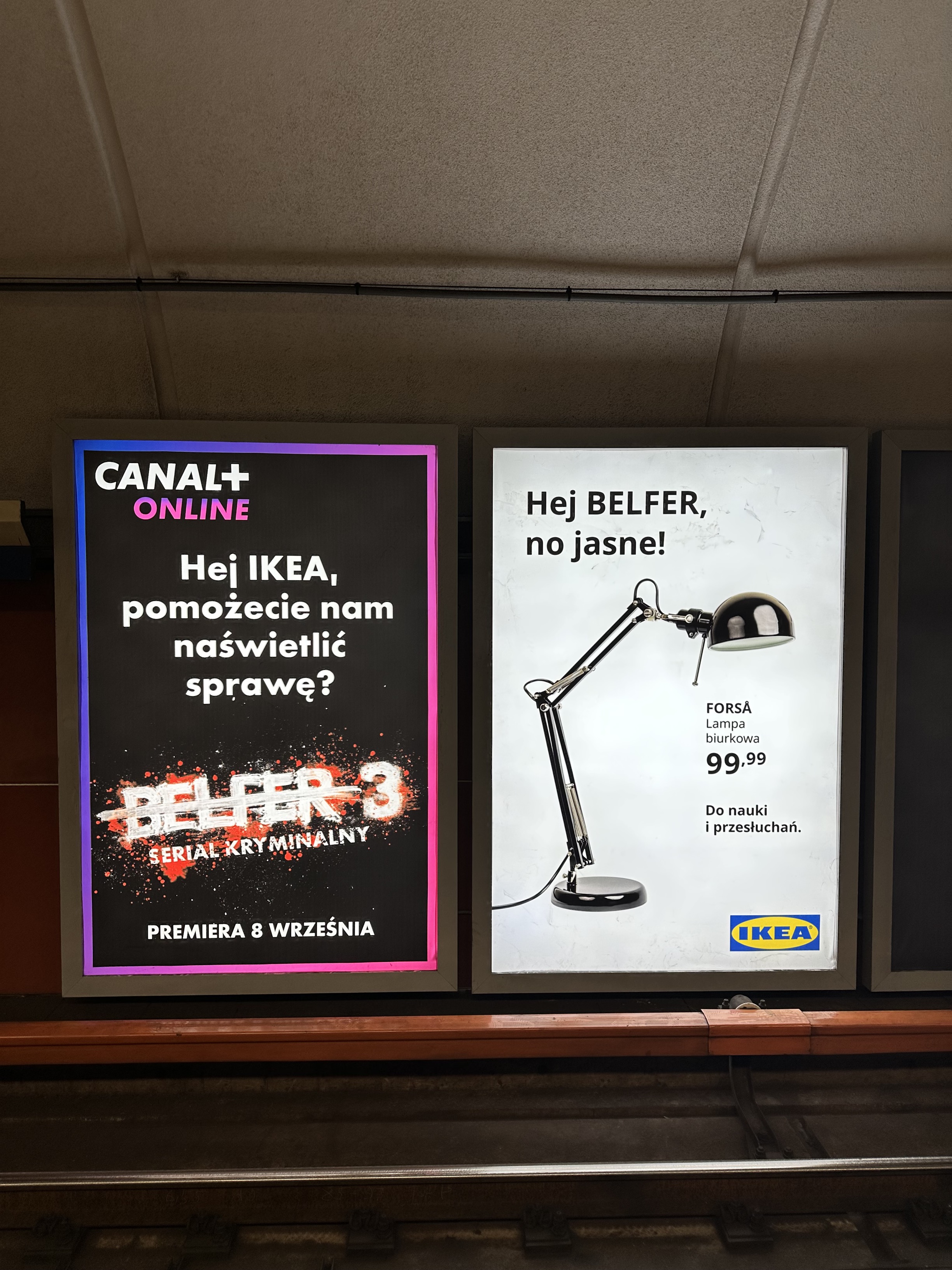 Po raz pierwszy w ramach serialowej kampanii wykorzystano też kontekstowo potencjał komunikacji pomiędzy CANAL+ a IKEA. Ideą wspólnych zaczepek – wyzwań jest pokazanie z dystansem i humorem, że sprzęty czy akcesoria dostępne w IKEA mogą służyć też śledztwu Belfra, np. lampka biurowa może służyć do nauki, ale też do naświetlenia kryminalnej sprawy czy przesłuchań. Ta część kampanii opiera się na miksie działań OOH i socialowych.