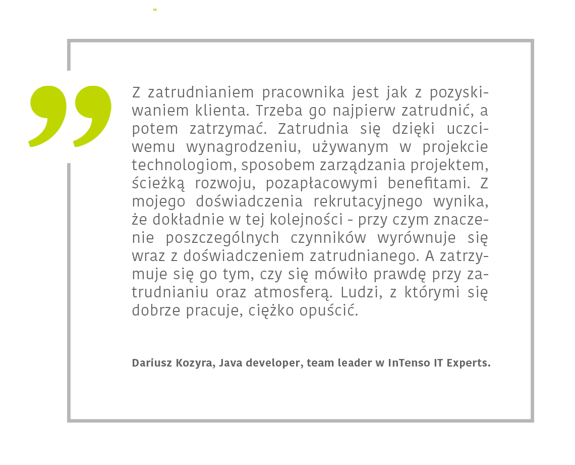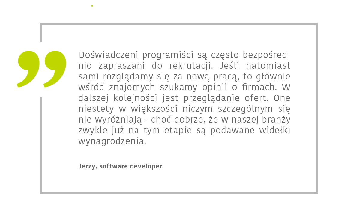 Z rozmów z programistami i rekruterami wynika, że znają oni swoje wzajemne oczekiwania. Jednak nadal większość kampanii rekrutacyjnych, czy nawet pojedynczych działań, jest sztampowa i powtarzalna. Słowem – odpychająca. W stale rekrutujących firmach IT, proces pozyskiwania pracownika to strategia. Powinna ona opierać się na rozpoznanych potrzebach kandydatów.