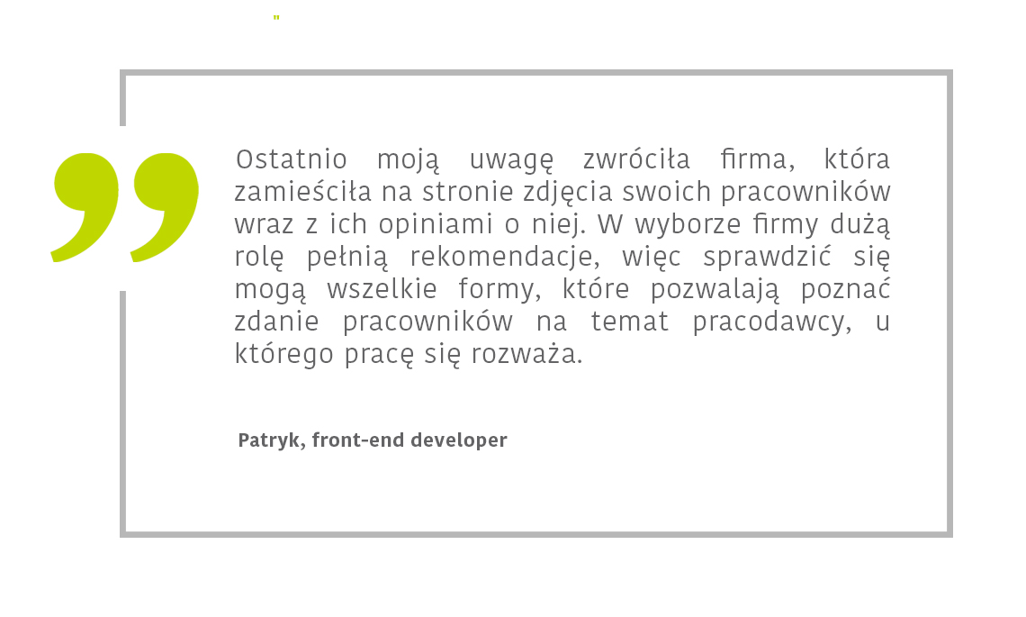 Firmy IT coraz częściej same namawiają pracowników do podzielenia się opiniami, które następnie są oficjalnie publikowane na ich stronach. Dodatkowym trust builderem są zdjęcia pracowników.