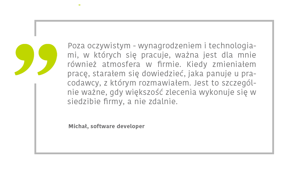 - doświadczenie zawodowe: czym się zajmuje – jakie ma stanowisko (i jak sam je nazywa) oraz zakres obowiązków; na jakich technologiach się zna; na jakim jest etapie rozwoju zawodowego; jak lubi się dokształcać itp.