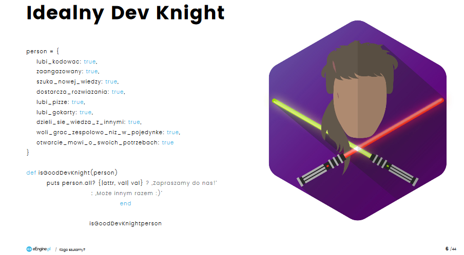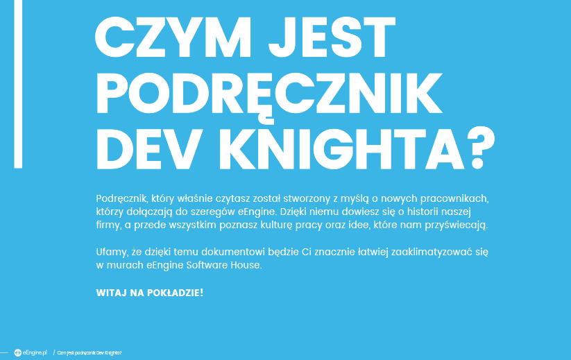 Kolejny rodzaj contentu, który urozmaici ofertę dla kandydatów, to podręczniki onboardingowe. Nie są już one wyłącznie domeną wielkich korporacji. Pomagają nowym pracownikom wdrożyć się w obowiązki i poznać zasady panujące w firmie. Taki dokument w formie e-booka przygotował eEngine Software House. Ciekawa oprawa graficzna, treść przygotowana z myślą o grupie docelowej, mnóstwo informacji na temat codziennego funkcjonowania zespołu – „Podręcznik Dev Knighta” z pewnością dobrze spełnia swoje zadanie.