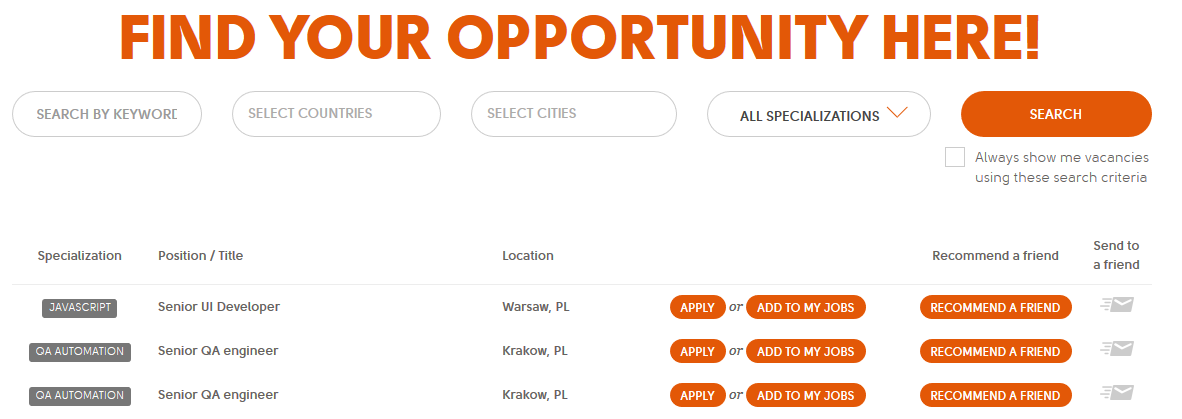 - wyszukiwarkę ogłoszeń wraz z opcją aplikowania, zarekomendowania oferty znajomemu, czy dodania ogłoszenia do zakładki „my jobs”