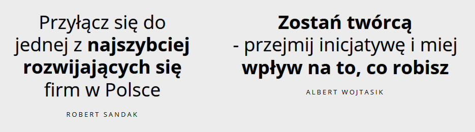 Strona kariery może jeszcze zawierać testimoniale, czyli – w tym przypadku – autentyczne wypowiedzi pracowników na temat pracy w danej firmie. Tak jak na co dzień poszukujemy opinii na temat produktów i usług, tak przed rozmową z potencjalnym pracodawcą chcemy sprawdzić z kim mamy do czynienia. Kandydaci informacji szukają na forach, czy w serwisach zawierających opinie o pracodawcach (np. GoWork.pl).