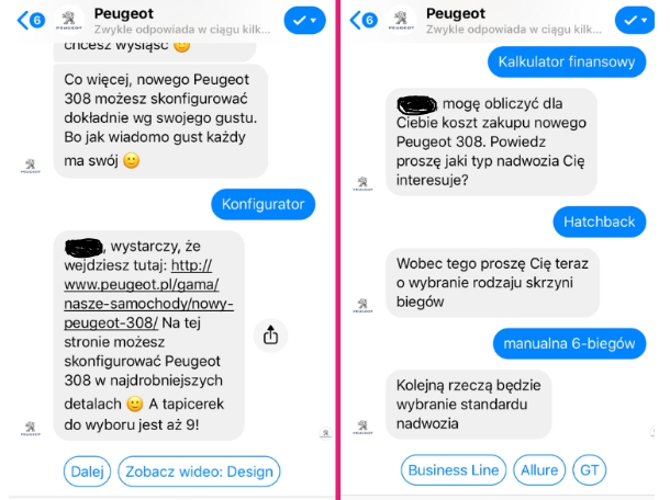 Przykładem marki, która postanowiła nawiązać z nami współpracę już w 2017 roku był Peugeot. Ta znana firma postanowiła wprowadzić chatbota do obsługi klientów zainteresowanych modelem Peugeot 308. Wspomagaliśmy ten brand w umawianiu jazd testowych oraz udzielaniu odpowiedzi na zapytania klientów. Skomplikowane dane techniczne nie stanowiły żadnego problemu dla wprowadzonego do obsługi klienta chatbota. Poniżej znajdziesz wycinek rozmowy klienta z wirtualnym asystentem. To naprawdę działa! Możesz samodzielnie przetestować chatbota Peugeota, korzystając z Messengera na fanpage’u marki.