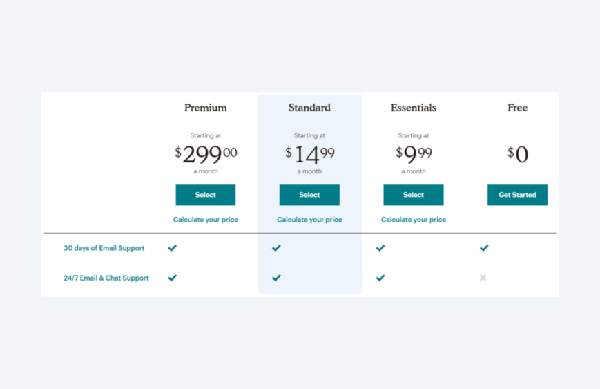 MailChimp oferuje wielopoziomowość cen. Ich pierwszy plan za 9,99 dolarów miesięcznie to pakiet „Essentials”. Dzięki niemu możesz obsługiwać maksymalnie pięćset kontaktów (cena wzrasta do 19,99 dolarów przy tysiącu kontaktów). Niektóre funkcje są powiązane z konkretnym planem i niestety brakuje możliwości zapisania się na wersję próbną, aby je sprawdzić. Dla początkujących może to być trochę frustrujące. Brak możliwości przetestowania opcji utrudnia ustalenie, jakich narzędzi faktycznie potrzebujemy. Możemy jednak w dowolnym momencie zmienić swój plan. Ich wielopoziomowa wycena jest całkiem dobra, jednak wydaje się, że brakuje jeszcze jednego planu, ponieważ różnica między planem „Standard” a „Premium” wynosi ponad 250 dolarów i nie ma między nimi aż tak dużej różnicy w oferowanych funkcjach.