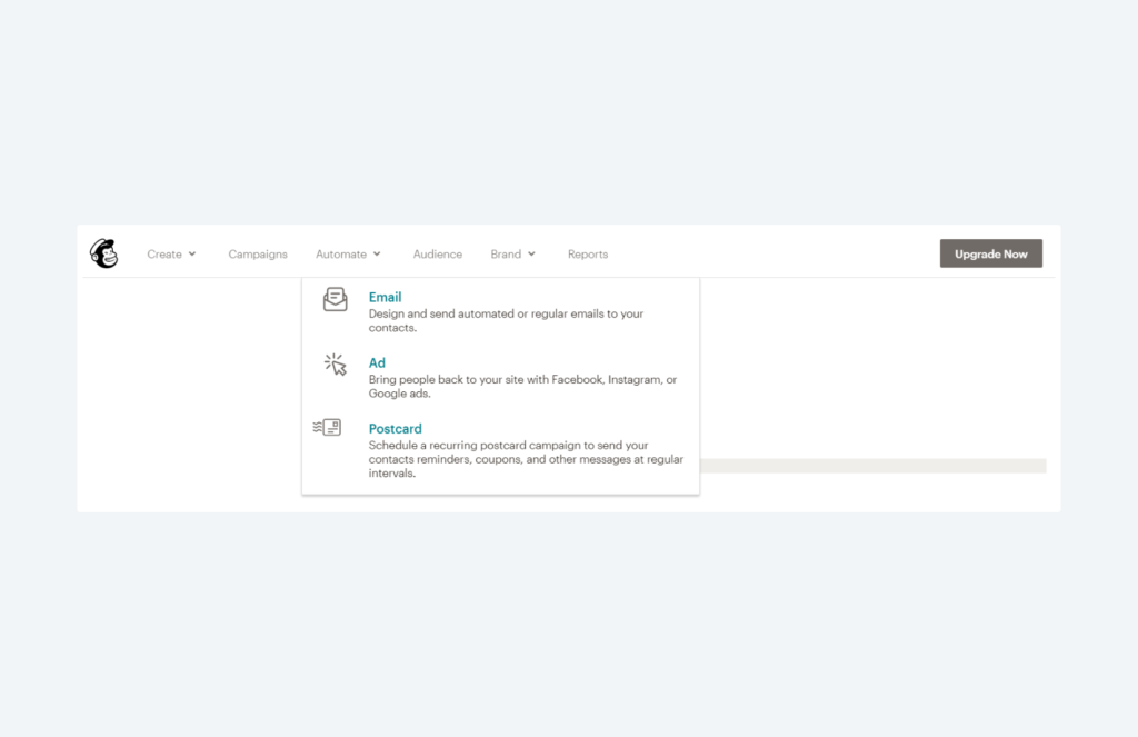Wreszcie – pulpit nawigacyjny. MailChimp ma przypięte u góry menu, w którym możemy wybrać dedykowaną sekcję, nad którą chcemy pracować. Menu nie jest widoczne po przejściu do ekranu edycji. Aby przełączyć kartę, musimy wrócić do pulpitu nawigacyjnego, używając klawisza Backspace.