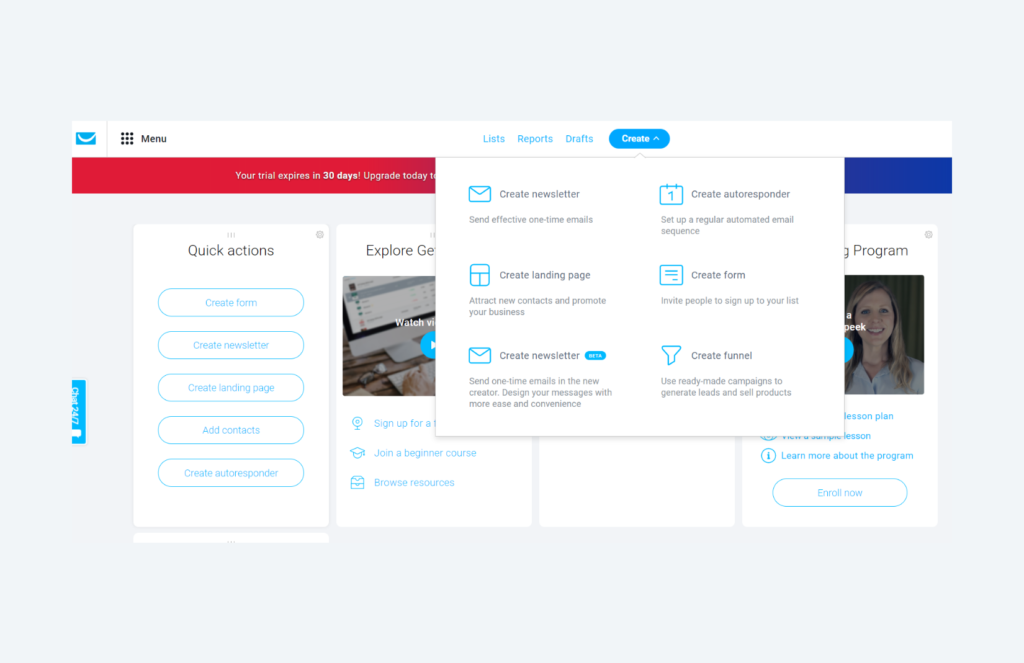 Pulpit nawigacyjny GetResponse z początku wydaje się bardzo prosty, ale po chwili staje się nieco mylący. Działa głównie w oparciu o kafelki, więc musimy przewijać stronę, aby zobaczyć wszystkie opcje. Możemy jednak uzyskać dostęp do tych samych opcji z menu rozwijanego lub z górnego paska. Mamy więc trzy punkty dostępu do tych samych funkcji. Niektórzy mogą uznać to za przydatne, ale osobiście dla mnie wydawało się to nieco chaotyczne. Wygląd panelu jest podobny do MailChimp.