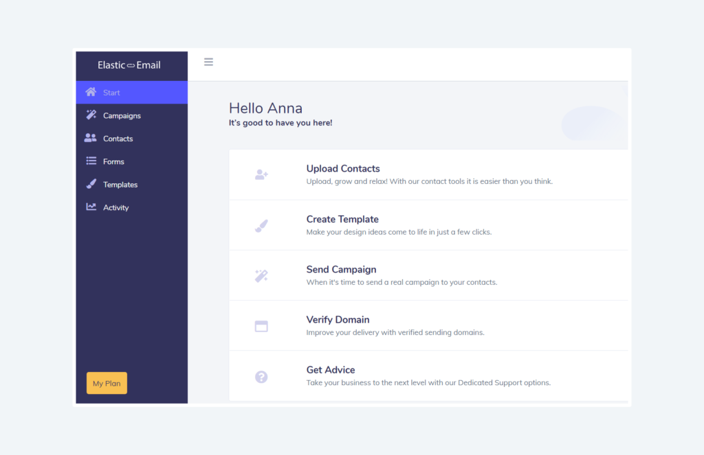 Pulpit nawigacyjny Elastic Email ma dość minimalistyczny wygląd. Na stronie głównej znajduje się pasek boczny ze wszystkimi opcjami i szybkimi poleceniami, dzięki czemu konfiguracja jest łatwa w użyciu i nie przytłacza. Po wybraniu sekcji, do której chcemy uzyskać dostęp, pasek boczny jest nadal widoczny, a jeśli potrzebujemy więcej miejsca, możemy go zminimalizować. Wtedy zobaczymy tylko ikony. W ten sposób nadal możemy zobaczyć wszystkie opcje i uzyskać do nich dostęp, ale jednocześnie nie zasłaniają one widoku.