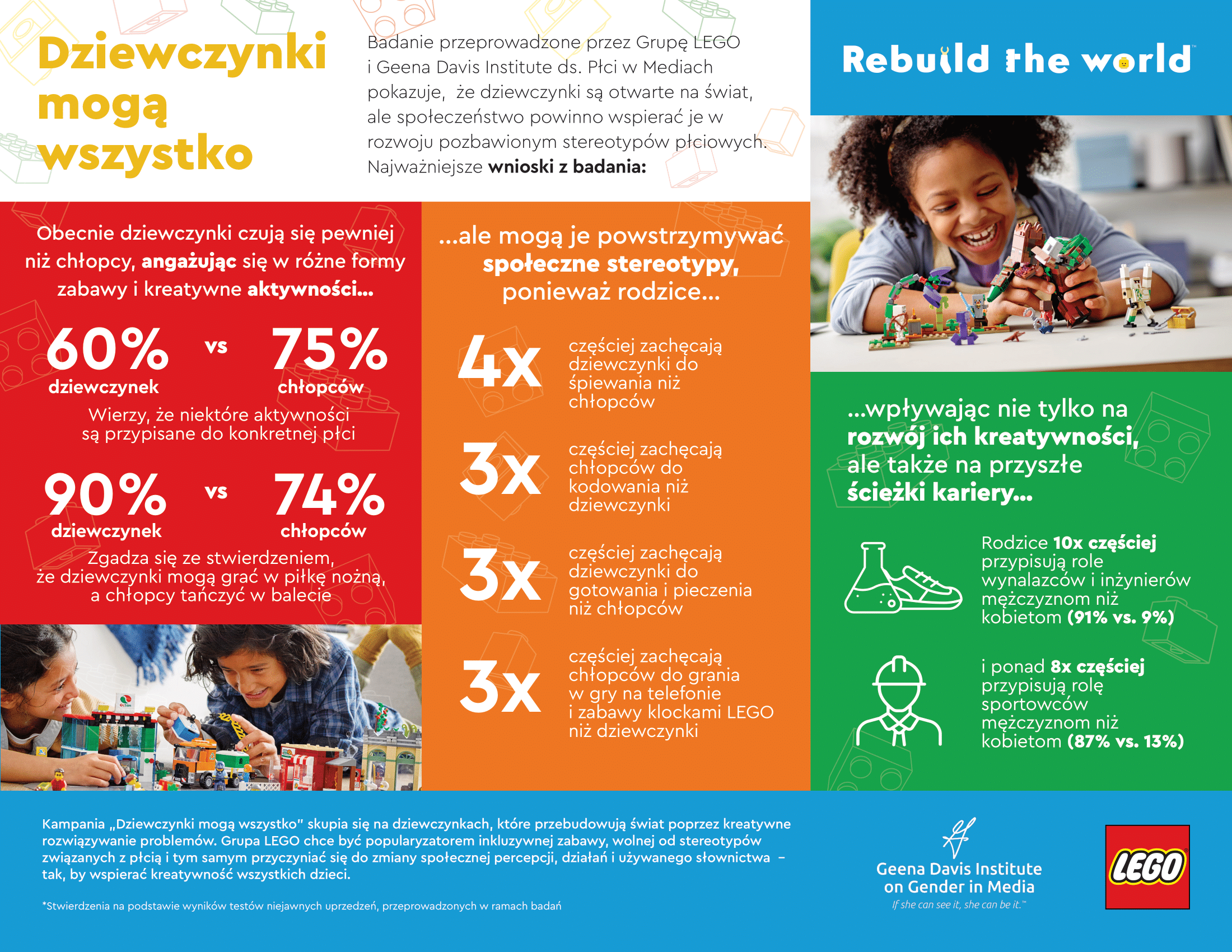 9 na 10 polskich dziewczynek nie postrzega świata przez pryzmat stereotypów związanych z płcią i zgadza się ze stwierdzeniem, że „to ok, jeśli dziewczynki chcą grać w piłkę nożną, a chłopcy tańczyć w balecie”. To jeden z wniosków z międzynarodowego badania przeprowadzonego przez Instytut Geeny Davis ds. Płci w Mediach na zlecenie Grupy LEGO w 7 krajach, w tym w Polsce. Mimo że dziewczynki nie zauważają podziałów płciowych, rodzice częściej zachęcają je do zabaw stereotypowo przypisywanych płci żeńskiej, co w efekcie może ograniczać swobodę wyrażania siebie i samorozwoju. W odpowiedzi na badania marka LEGO rozpoczyna w Polsce kampanię „Dziewczynki mogą wszystko” z udziałem m.in. Martyny Wojciechowskiej, aby zainspirować rodziców do myślenia o dzieciach niezależnie od stereotypów związanych z płcią.