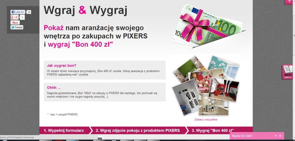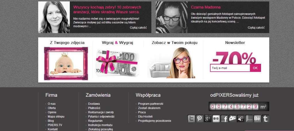 Prowadzimy konkurs na naszej stronie „Wgraj i wygraj”. Za interesujące aranżacje wnętrz z wykorzystaniem fototapet z naszej oferty przyznajemy bony do wykorzystania w naszym sklepie. Mamy jednak w planach przeprowadzenie kolejnych konkursów i akcji promocyjnych. Na naszym fan page’u przeprowadziliśmy też konkurs na okulary Deezeye. Polegał on za zaprojektowaniu odjechanych okularów, które potem przygotowaliśmy i wysłaliśmy do zwycięzców. Psychodeliczne, odjechane, zwariowane, tematyczne – oto jakie były projekty uczestników. Taki też jest cały PIXERS.