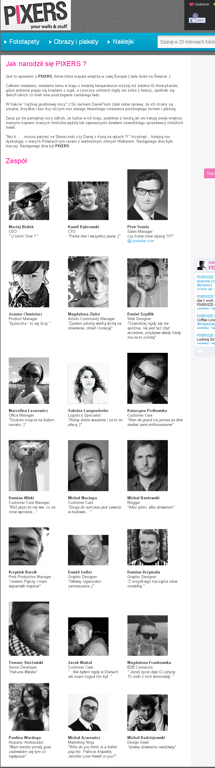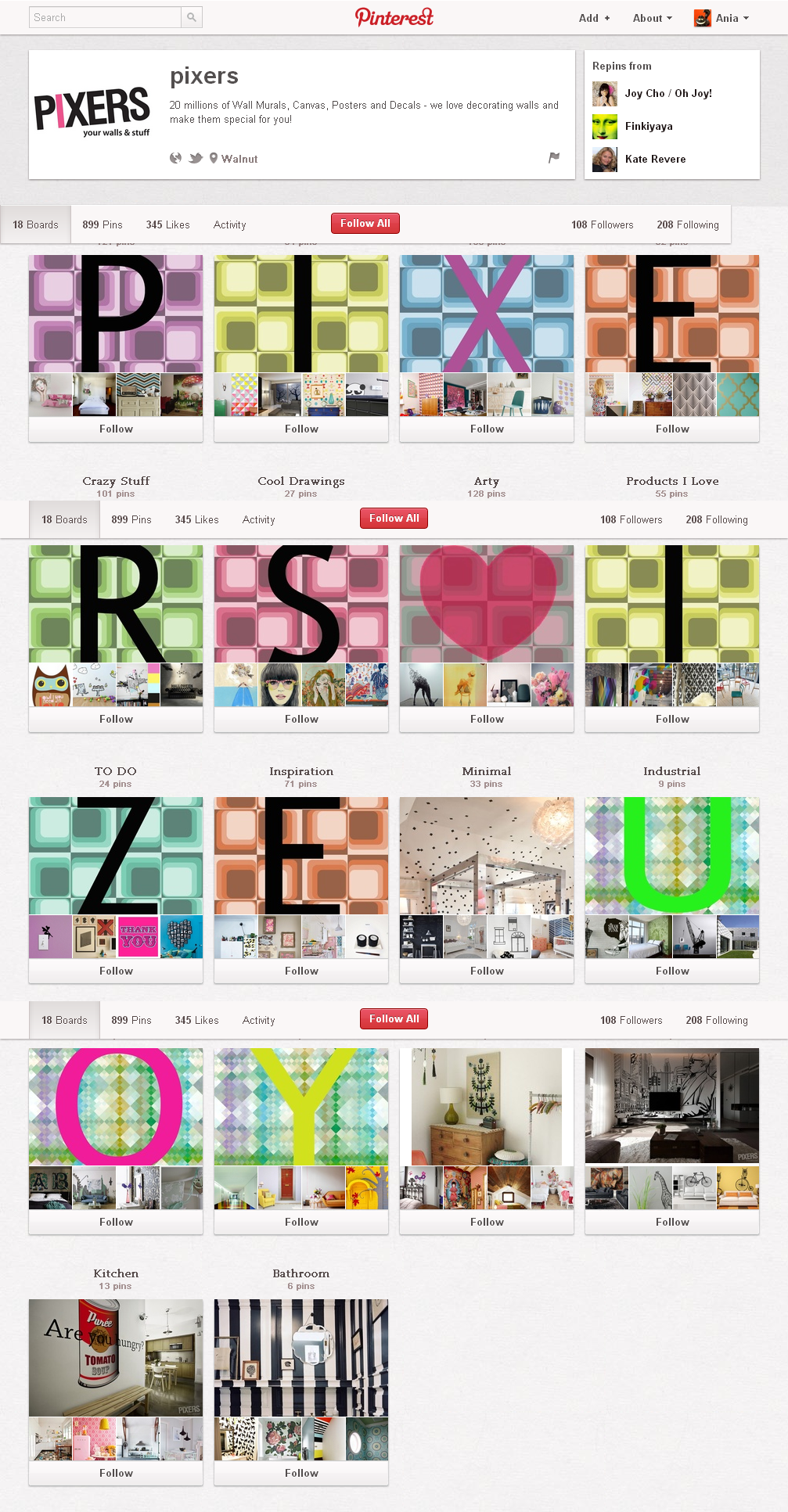 Posiadamy dwa fan page’e – polski i angielskojęzyczny. Prezentujemy na nich dizajnerskie inspiracje, zarówno nasze, jak i te ze świata. Korzystamy z nich także do kontaktu z klientami. Dodatkowo posiadamy konto na Flickr, Tumblr, Behance, Twitter. Korzystamy z tego aby zwiększyć zasięg naszych komunikatów i podprogowych przekazów, dzięki którym wszyscy wiedzą, że PIXERS jest taki fajny 🙂 Dodatkowo działamy także na Pintereście – jak zawsze w sposób zakręcony i bardzo kolorowy. Kategorie przygotowaliśmy tak, aby jak najszerzej pokazać właśnie to, co nas inspiruje i to, co chcielibyśmy na przykład mieć w domu, ale jeszcze nie mamy, bo praca w PIXERS pochłania cały nasz czas.
