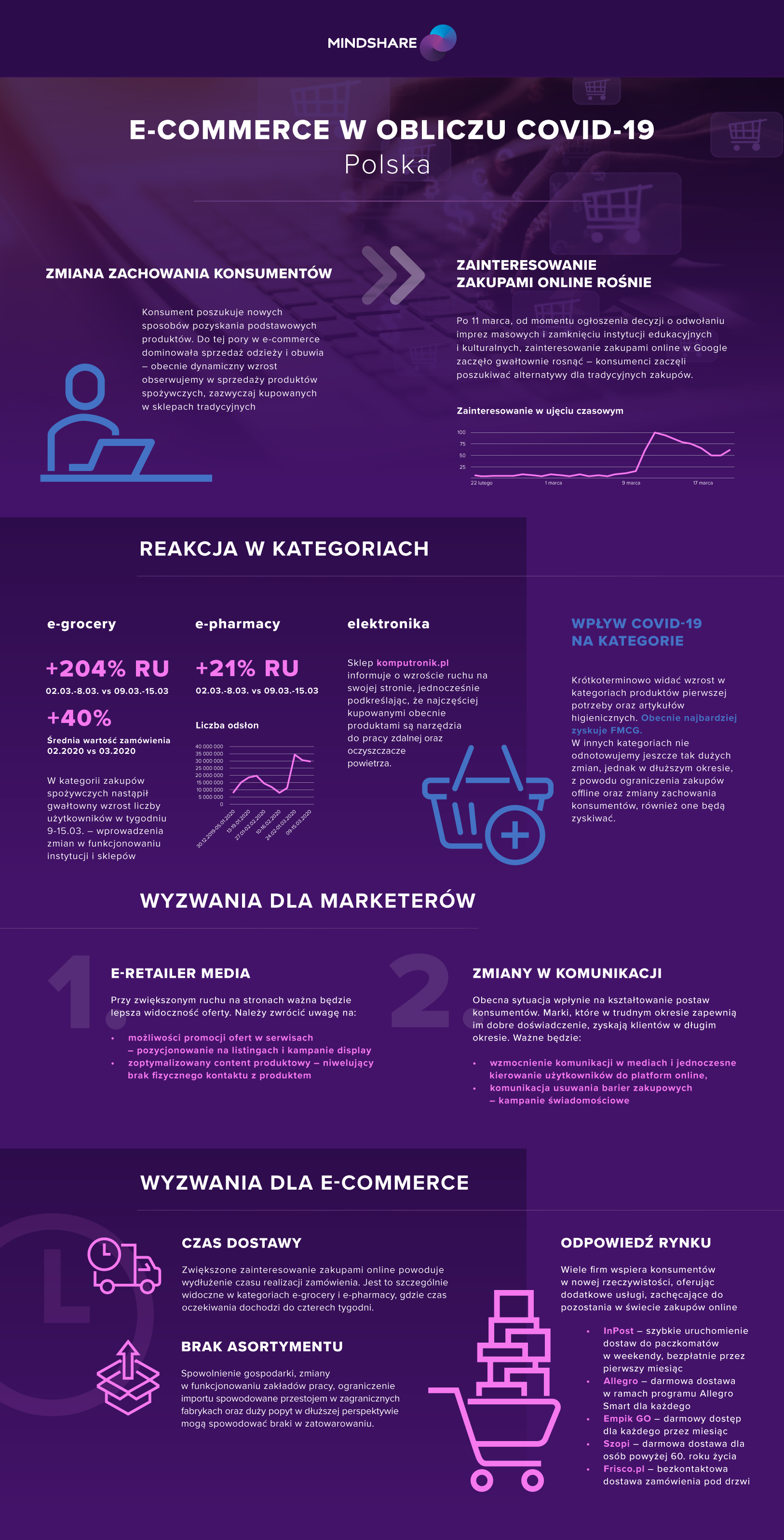 Przy zwiększonym ruchu na stronach e-retailerów ważna będzie lepsza widoczność oferty. Obecna sytuacja wpłynie także na kształtowanie postaw konsumentów. Marki, które w trudnym okresie zapewnią im dobre doświadczenie, zyskają klientów w długim okresie. Natomiast branża będzie musiała sprostać dwóm wyzwaniom – przez zwiększoną liczbę zamówień, spowolnienie produkcji oraz ograniczenie importu, problemem mogą być wydłużony czas dostawy, oraz bieżące uzupełnianie asortymentu.