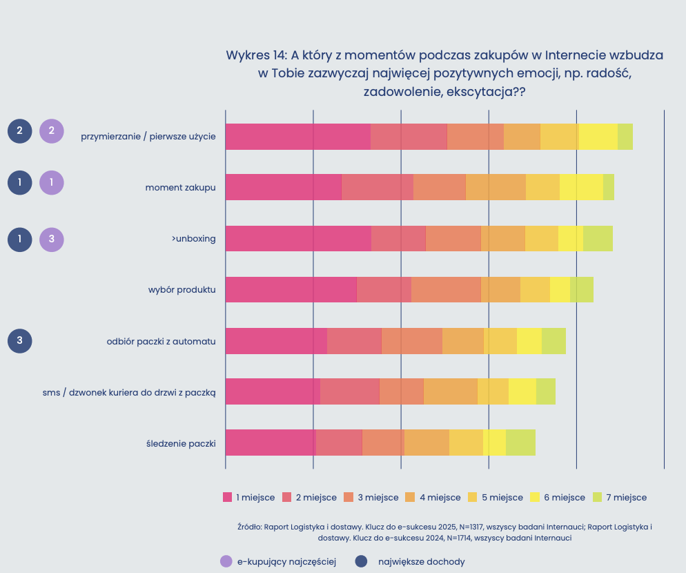 - Ponad 40% badanych deklaruje, że moment odbioru paczki – czy to w automacie, czy od kuriera – budzi w nich pozytywne emocje takie jak radość, a wręcz często ekscytacja, co potem skutkuje zwiększonym poziomem zadowolenia z całego procesu zakupowego i zakupu.