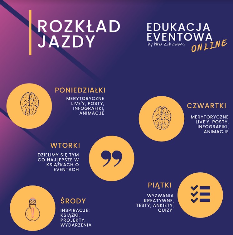 W duchu wzajemnego wsparcia i poszerzania wiedzy o eventach powstała na Facebooku grupa – Edukacja Eventowa Online by Nina Żukowska. Inicjatywa narodziła się z myślą o tych, którzy chcą się stale rozwijać i poszerzać swoje horyzonty. Grupa zrzesza nie tylko przedstawicieli agencji eventowych, ale także freelancerów i tych, którzy dopiero zaczynają swoją przygodę z eventami.