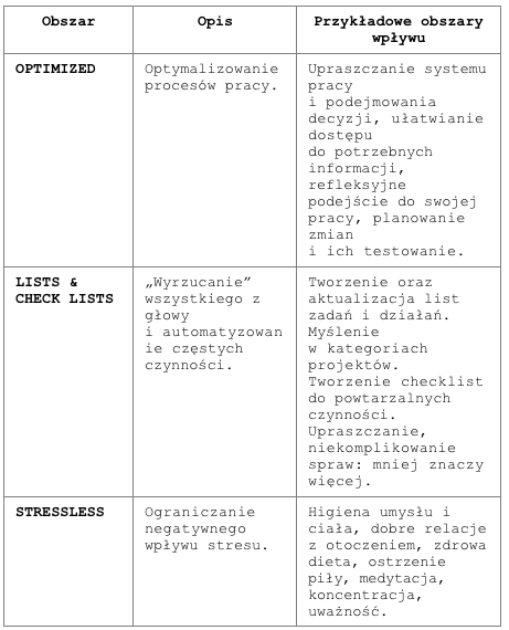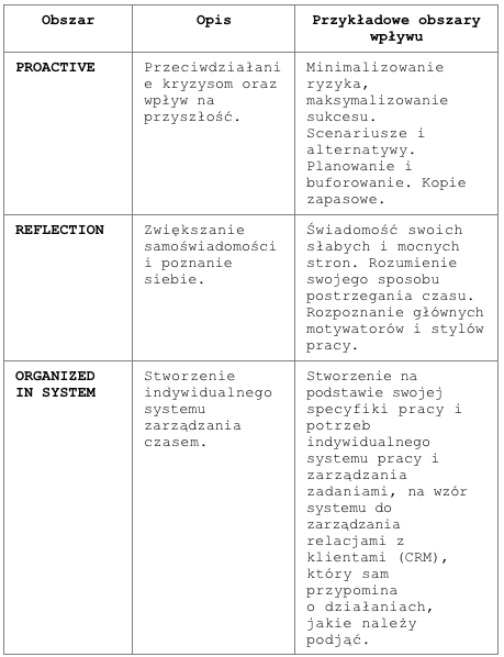 Postawą, którą warto w sobie ukształtować w pracy i w życiu osobistym, jest przejmowanie kontroli nad swoimi zadaniami i niepozwolenie im, aby to one przejęły kontrolę nad nami. Efektem zbudowania ESP ma być większa satysfakcja z życia osobistego i zawodowego, a wygospodarowany czas należy wykorzystać tak, jak chcemy — niekoniecznie na dodatkową pracę ☺.