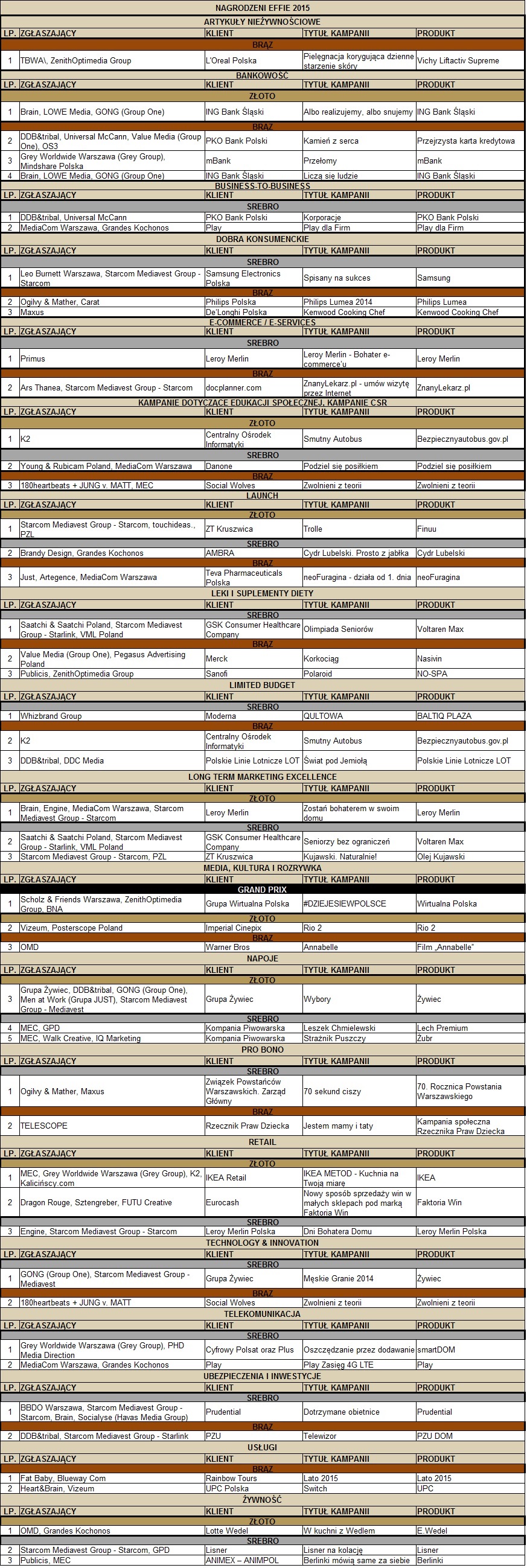 Tytuł najbardziej efektywnej agencji roku otrzymała agencja DDB&tribal, a najbardziej efektywnej agencji mediowej Starcom Mediavest Group – Starcom. Zajęli oni pierwsze miejsca w rankingach Effie 2015.