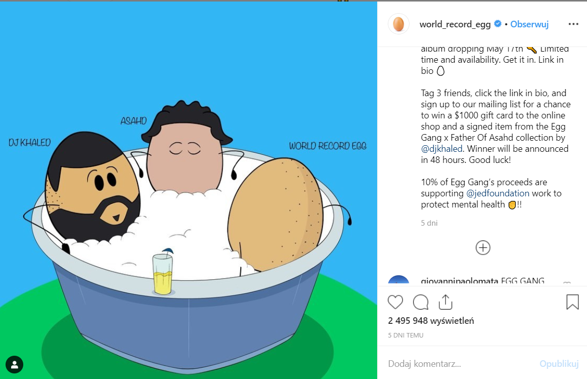 Teraz rekordowe jajko nawiązało współpracę ze słynnym Didżejem Khalidem, w ramach której stworzono kolekcję t-shirtów i bluz zatytułowaną „Egg Gang x Father Of Asahd”. Każde ubranie posiada charakterystyczną grafikę z motywem jajka.