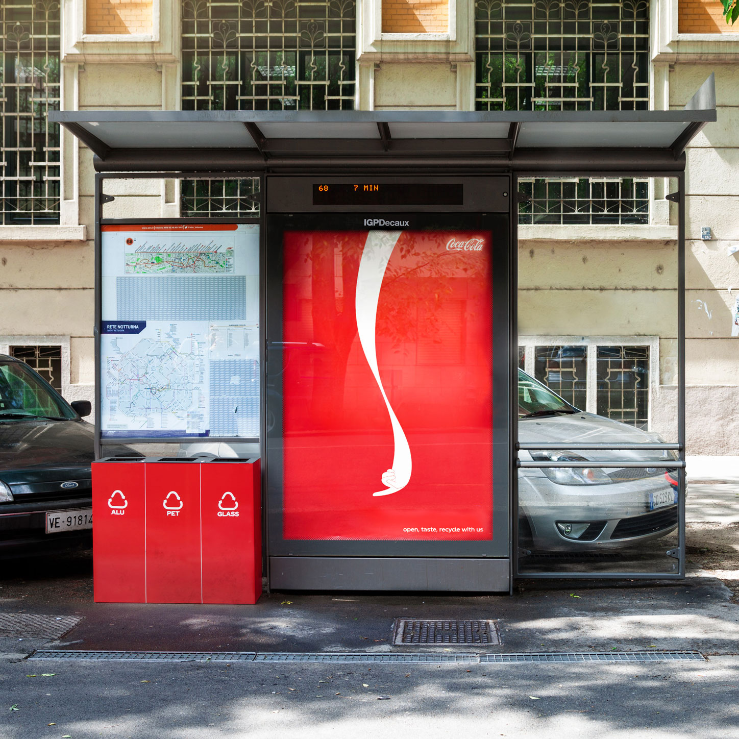 Ostatni czas to dla marki Coca-Cola to bardzo intensywne działania na rzecz ochrony środowiska. Jednym z nich jest właśnie kampania „Open, taste, recycle with us” zachęcająca do recyklingu odpadów. Billboardy z hasłem promocyjnym umieszczone są tuż obok specjalnie przygotowanych koszy recyklingowych, a słynny znak firmy kieruje odbiorcę wprost do nich. Poprawa wizerunku Coca-Coli akurat w kwestii ochrony środowiska to istotny zabieg PR-owy. W dużej mierze dlatego, że wciąż większość napoi jest produkowanych w plastikowych butelkach (dużym echem w mediach społecznościowych odbiło się zdjęcie ukazujące butelkę flagowego napoju marki na plaży z hasztagiem „#cocacolatochybatwoje”).