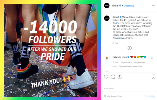 Kolejny przykład to kampania marki Diesel, chociaż nie do końca możemy mówić tutaj o złej kreacji marketingowej. Czerwiec jest znany od niedawna jako miesiąc pride month, czyli miesiąc dedykowany społeczności LGBT. Wiele firm z tej okazji przygotowało specjalne kampanie reklamowe, w tym również firma Diesel, która postanowiła stworzyć specjalną kolekcję ubrań, będącą hołdem dla społeczności LGBT. Nie wszystkim do gustu przypadły jednak wartości wyznawane przez markę. Po opublikowaniu kampanii z Instagrama firmy „znikło” 14 000 followersów. Co w tej sytuacji postanowił zrobić dział marketingu Diesela? Przekuć to w kolejną, świetną kampanię i pochwalić się tym (jakże by inaczej!) na Instagramie, jednocześnie dziękując osobom, które zaprzestały obserwowania profilu.