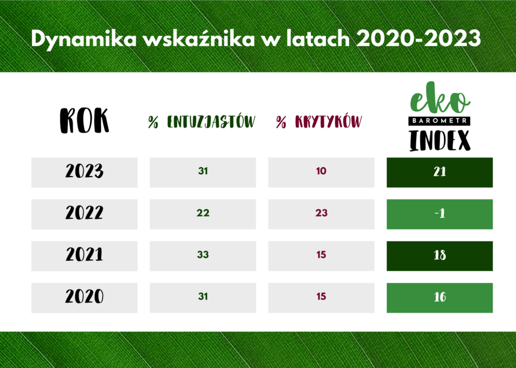 Względem poprzedniego roku, EKObarometr Index odnotował wzrost aż o 22 punkty względem 2022 roku, kiedy to głosy EKO-Krytyków równoważyły poglądy EKO-Entuzjastów. Jednak, co to właściwie oznacza z punku widzenia świadomości polskiego społeczeństwa i jak prawidłowo odczytywać notowania wskaźnika?
