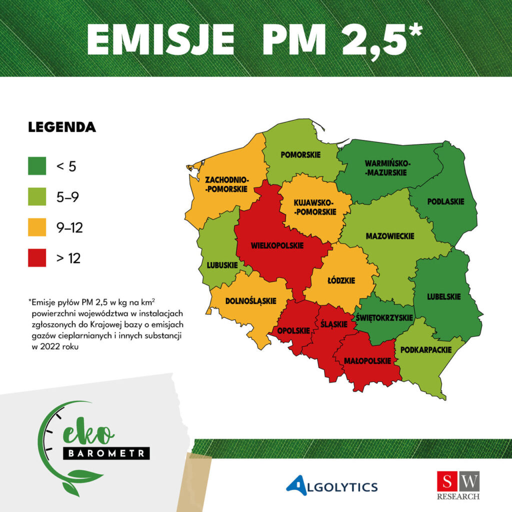Dzięki uprzejmości firmy Algolytics porównano wartości EKObarometr Index w poszczególnych województwach z oficjalnymi statystykami w tych samych jednostkach terytorialnych. Okazało się, że dla wielu makro wskaźników ekologicznych zaobserwowano korelacje z wartościami EI. Jednym z bardziej wyrazistych przykładów jest współzależność z często raportowaną w mediach średnioroczną emisją pyłów PM 2,5.