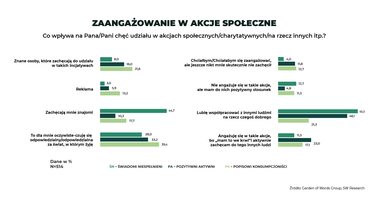 Obecnie już 52,3% Polaków wspiera działania charytatywne – przede wszystkim te lokalne, rzadziej ogólnopolskie lub międzynarodowe. Wśród zaangażowanych grup dominują wyraźnie 3 typy psychograficzne konsumentów – tzw. świadomi niespełnieni, pozytywni aktywni oraz popisowi konsumpcjoniści. Mają jednak różne motywacje – pierwsze dwie grupy pomagają przede wszystkim dlatego, że lubią współpracować z innymi ludźmi na rzecz czegoś dobrego. Poza tym, czują się odpowiedzialni za świat, w którym żyją. Dodatkowo na świadomych niespełnionych działają zachęty ze strony znajomych, a pozytywni aktywni twierdzą, że sami wręcz zachęcają innych, bo zaangażowanie mają we krwi. Dla popisowych konsumpcjonistów jest to oczywista sprawa, że odpowiadają za swoje otoczenie. Jednak nie bez znaczenia są tu tzw. znane twarze, które zachęcają do udziału w takich inicjatywach. Ze względu na tę różnorodność kluczowe jest dostosowanie komunikacji ekotrendów pod kątem potrzeb i motywacji, które kierują poszczególnymi grupami.