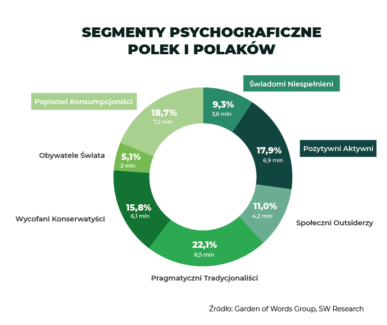 W badaniu „Polki i Polacy” – które przygotowała nasza agencja Garden of Words Group, wraz z SW Research – chcieliśmy sprawdzić szeroko pojęte zwyczaje obywateli, przejawiane w różnych sferach życia – między innymi w kwestiach społecznych. Wyróżnionych zostało 7 grup różniących się od siebie cechami demograficznymi, psychograficznymi i behawioralnymi, z których najliczniejsi w Polsce to pragmatyczni tradycjonaliści (8,5 mln), popisowi konsumpcjoniści (7,2 mln), pozytywni aktywni (6,9 mln) i wycofani konserwatyści (6,1 mln). Różnią się oni wiekiem, miejscem zamieszkania, płcią, ale przede wszystkim – zwyczajami konsumenckimi. Każda grupa ma charakterystyczne dla siebie sposoby spędzania wolnego czasu, style wydawania pieniędzy, ale też stosunek do kluczowych obszarów życia: pracy, rodziny czy seksu.