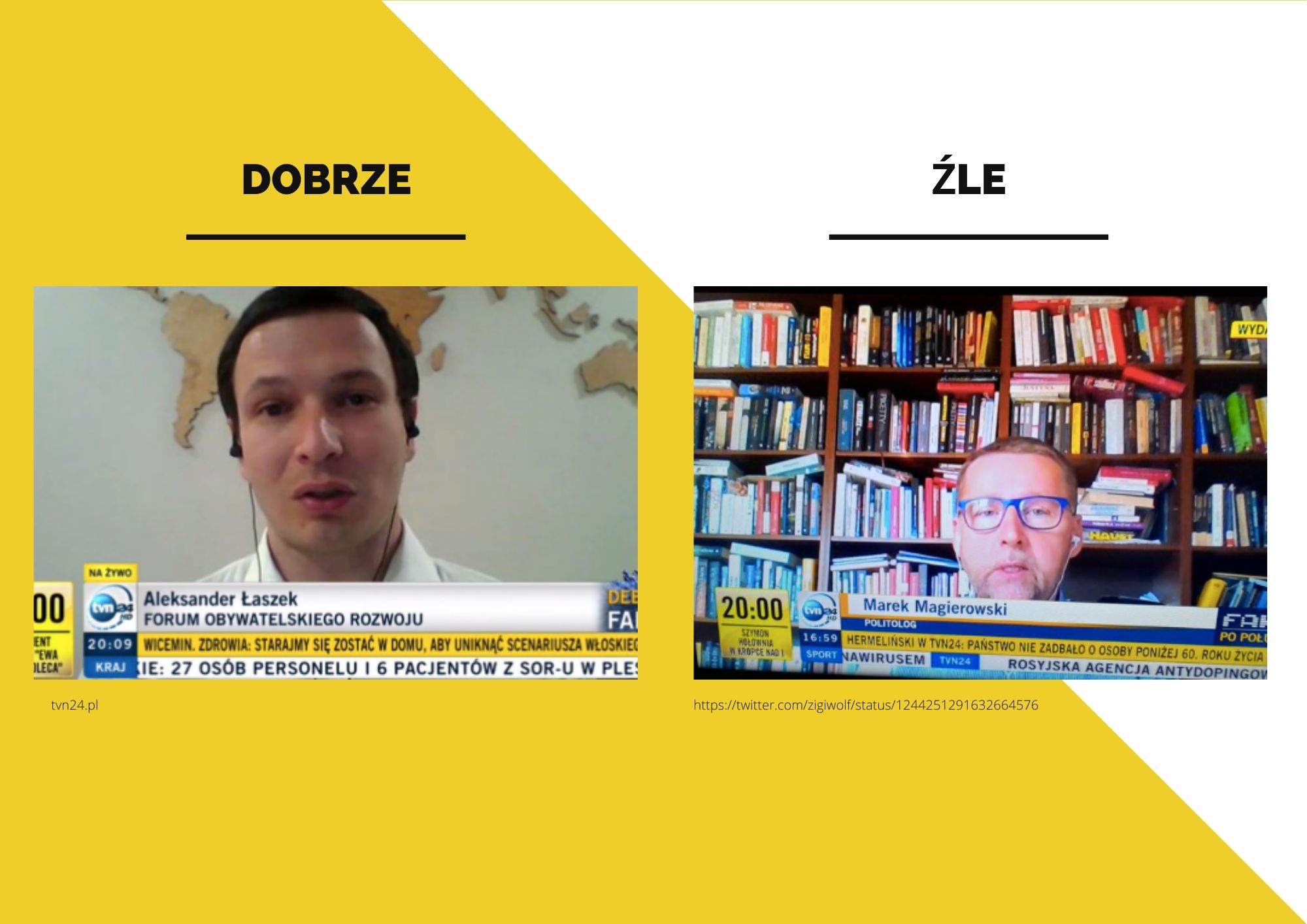 Występując na żywo przed kamerą, warto znać zasady trój podziału kadru. Polega on na „narysowaniu” dwóch poziomych i pionowych linii, które będą dzielić ekran na dziewięć pól. Sylwetka eksperta powinna znaleźć się możliwie jak najbliżej punktów przecięć linii. Pamiętajmy też o paskach informacyjnych, które zajmują znaczną jego część.