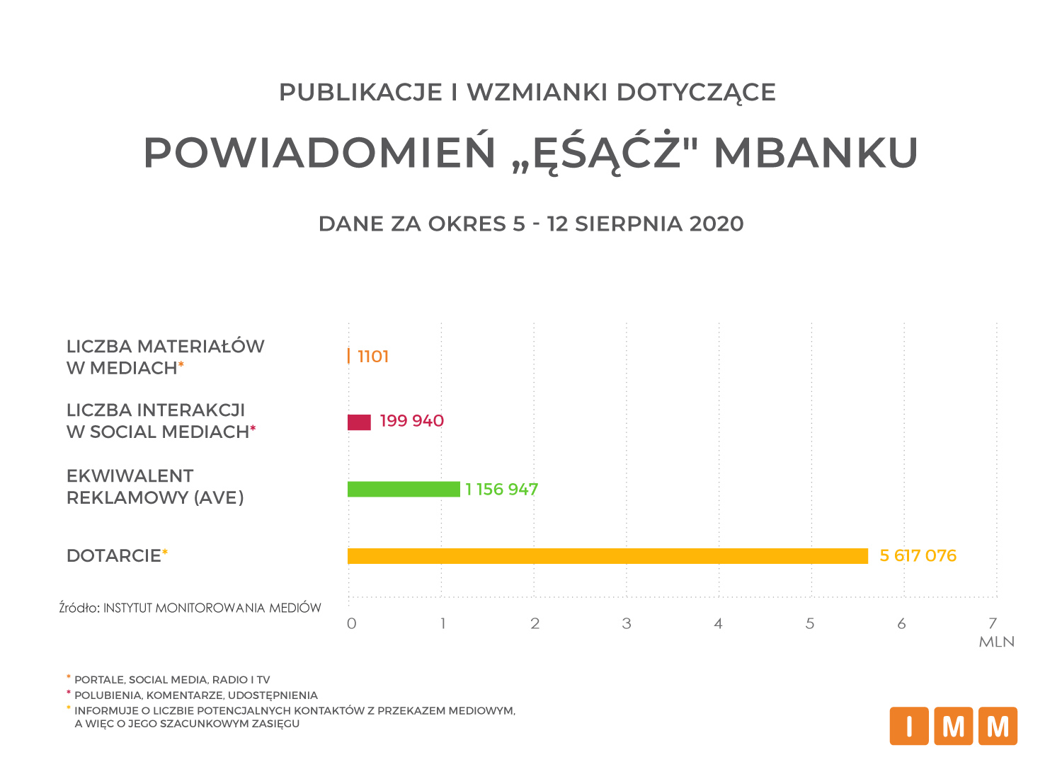 Internauci zareagowali błyskawicznie – w przeciągu zaledwie tygodnia w social mediach temat powiadomień „ęśąćż” mBanku przełożył się na ponad 136 tys. udostępnień, 60 tys. polubień i przeszło 2,8 tys. komentarzy. Autorzy z największą liczbą polubień, udostępnień i komentarzy to profile samego mBanku na Facebooku i Twitterze – łączna liczba interakcji tylko tych dwóch postów na dzień 17 sierpnia 2020 wynosi ponad 43 tys. z AVE 143 tys. złotych.