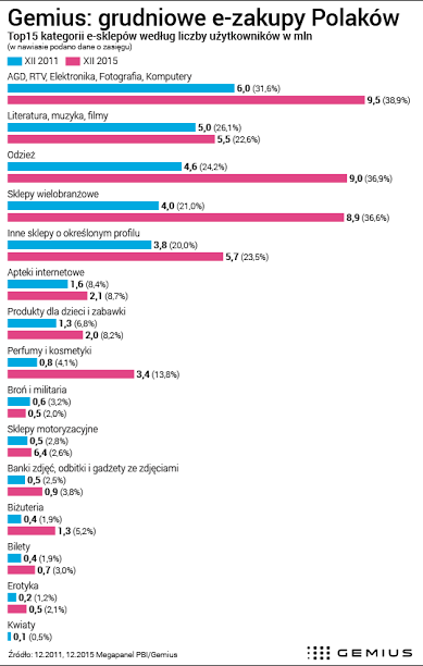 Jak pokazują dane Gemiusa, w ostatnim miesiącu 2015 roku niemal trzy czwarte użytkowników sieci odwiedziło strony internetowe e-sklepów. Największym powodzeniem cieszyły się elektronika (38,9 proc.) i odzież (36,9 proc.), najmniejszym kwiaty (0,5 proc.) oraz militaria (2 proc.).