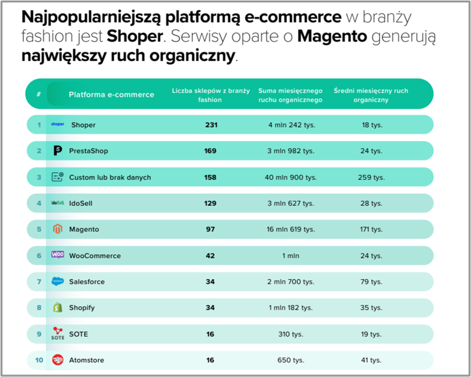 Najwięcej z 1 tys. sklepów z największym ruchem organicznym w branży fashion w Polsce działa na platformie Shoper (231 sklepów), ale to serwisy zbudowane na Magento i rozwiązania customowe generują średnio największy ruch organiczny. Wysoką jakość techniczną (Core Web Vitals) wykazują z kolei sklepy na oparte na Shopify, SOTE i AtomStore.