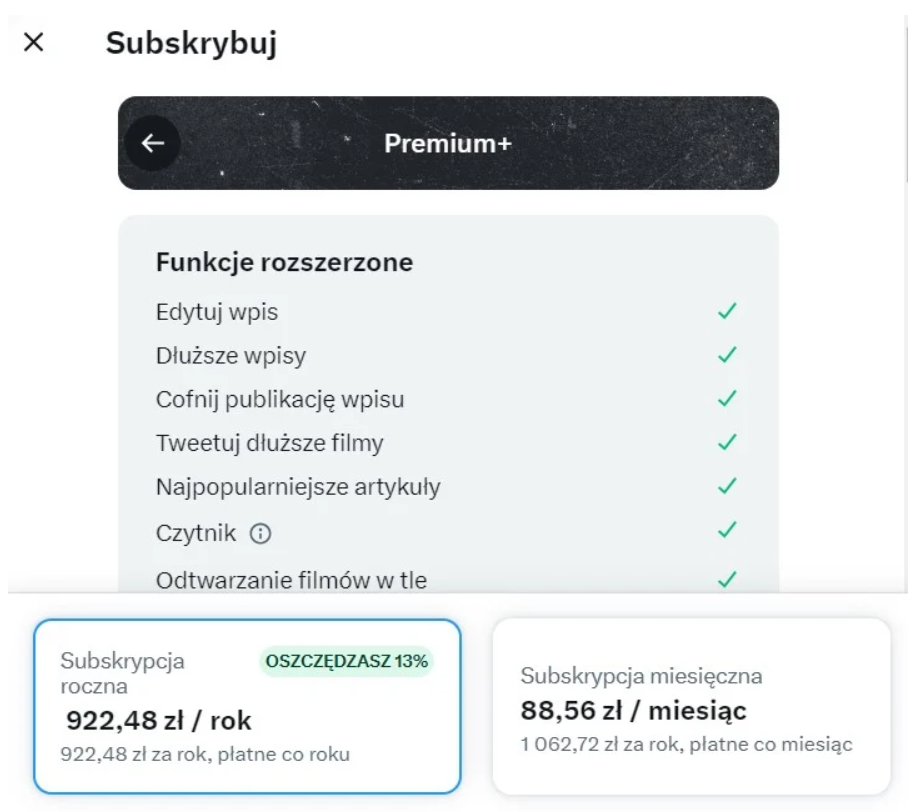 Pod koniec października można było wybrać jeden z trzech rodzajów pakietów na X. Ostatnia cena pakietu Basic wynosiła 142,85 zł rocznie (13,50 zł miesięcznie). Pakiet Premium kosztował 461,24 zł rocznie (44,28 zł miesięcznie), a pakiet Premium Plus 749,98 zł rocznie (72 zł miesięcznie).