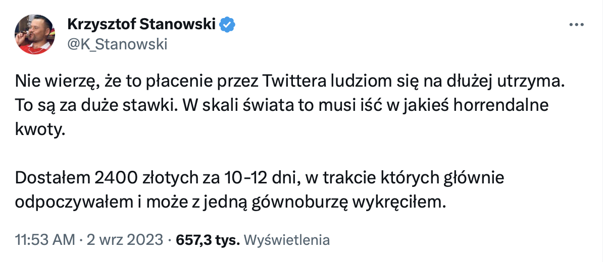 – Nie wierzę, że to płacenie przez Twittera ludziom się na dłużej utrzyma. To są za duże stawki. W skali świata to musi iść w jakieś horrendalne kwoty. Dostałem 2400 złotych za 10-12 dni, w trakcie których głównie odpoczywałem i może z jedną gównoburzę wykręciłem – napisał na swoim Twitterze Krzysztof Stanowski.