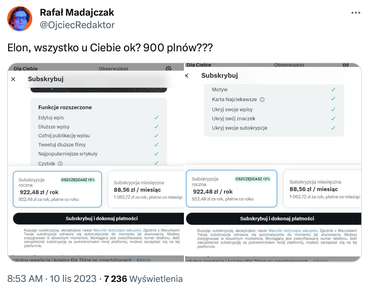 – Elon, wszystko u Ciebie ok? 900 plnów??? – napisał na swoim Twitterze redaktor Rafał Madajczak.