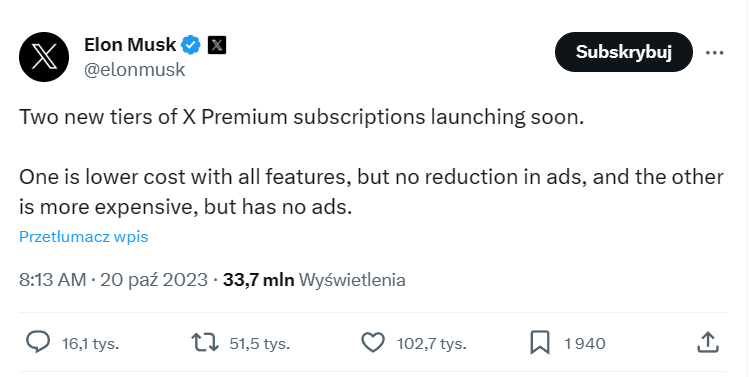 – Wkrótce pojawią się dwa nowe poziomy subskrypcji X Premium. Jeden jest tańszy ze wszystkimi funkcjami, ale bez redukcji reklam, a drugi droższy, ale nie ma w nim reklam – czytamy na Twitterze Muska.
