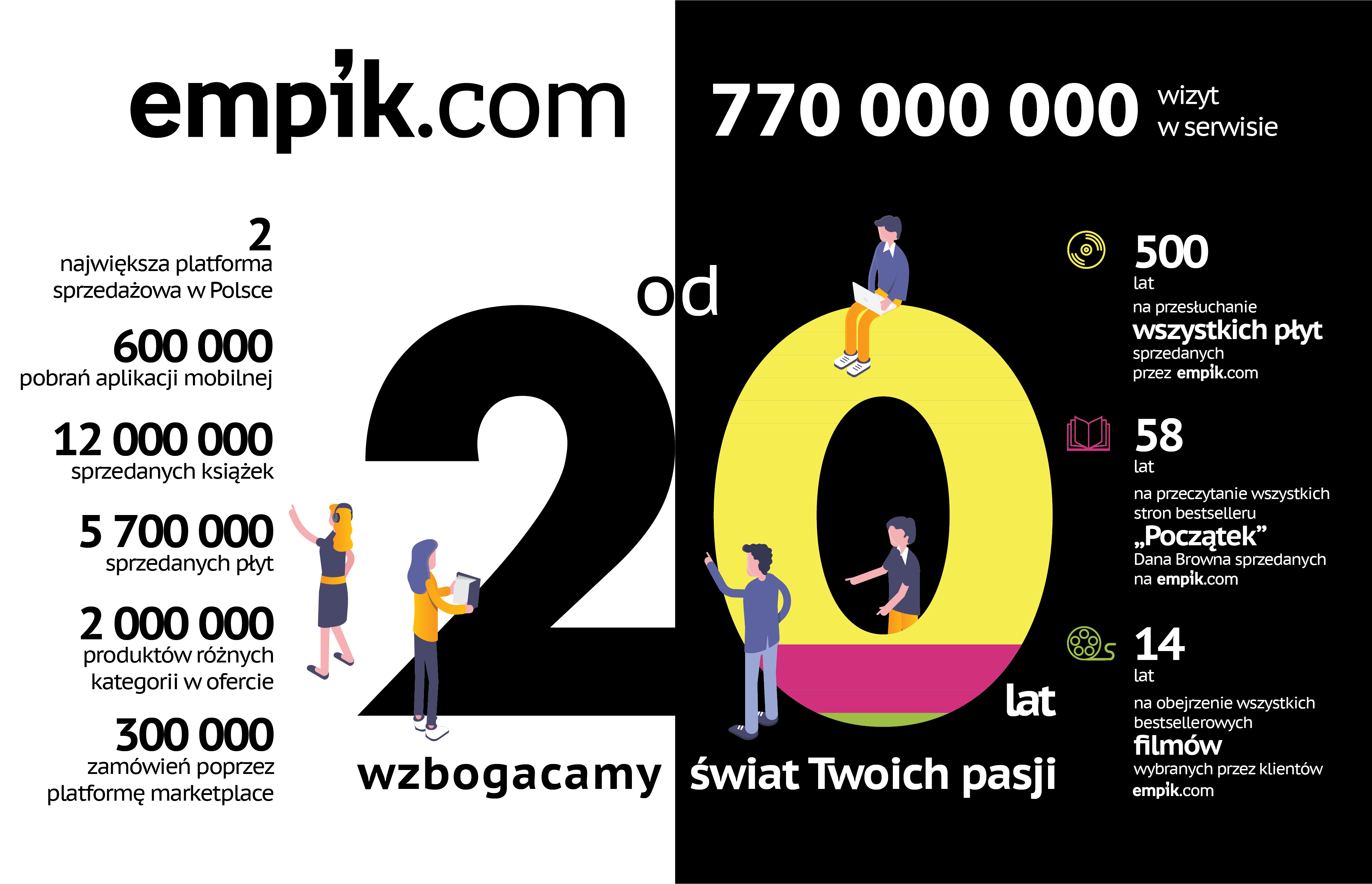 Empik.com to jeden z czołowych e-sklepów w Polsce – zarówno pod względem ruchu, jak i wielkości oferty. 2017 rok zamknął się liczbą 5 milionów zamówień i ponad 111 mln wizyt użytkowników. 68% klientów stanowią kobiety, a 32% mężczyźni. Aż 80% klientów Empik.com wciąż odbiera zakupy w tradycyjnych salonach dzięki usłudze darmowej dostawy. Platforma sprzedażowa ciągle się rozwija, stawiając na najnowsze technologie i rozwiązania pozwalające klientom na dokonywanie zakupów w łatwy sposób oraz w możliwie najkrótszym czasie. Rośnie również popularność usługi ekspresowej rezerwacji produktu z gwarancją odbioru w salonie w maksymalnie 2 godziny. Co więcej, właśnie pojawiła się nowa, ulepszona wersja aplikacji mobilnej Empiku, napisana w całości przez wewnętrzny zespół developerów. Aplikacja ma łączyć świat Empiku online i offline poprzez szereg funkcjonalności, które wkrótce zostaną wdrożone, takich jak: wyszukiwanie książki na półce, czy możliwość filtrowania wyników wyszukiwania per salon.
