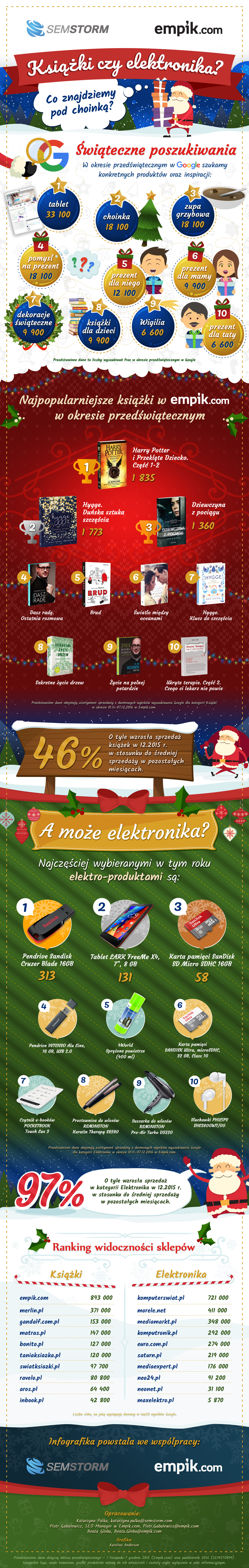 „Zakupy w empik.com wciąż trwają, trudno więc o rzetelne podsumowanie świątecznej sprzedaży” – przekonuje Piotr Gabalewicz, SEO Manager w empik.com. – „Jednak w ubiegłym roku odnotowaliśmy 46%-owy wzrost sprzedaży książek w grudniu w stosunku do średniej w pozostałych miesiącach. Jeszcze większy wzrost odnotowaliśmy w kategorii elektronika – aż 97%. Co jednak ważne, przygotowania do przedświątecznych zakupów warto rozpocząć wcześniej. Nie mam tutaj na myśli tylko kupujących, ale i marketerów, którzy przygotowują swoje strony internetowe pod kątem najlepszych odpowiedzi na zapytania użytkowników w wyszukiwarce”.