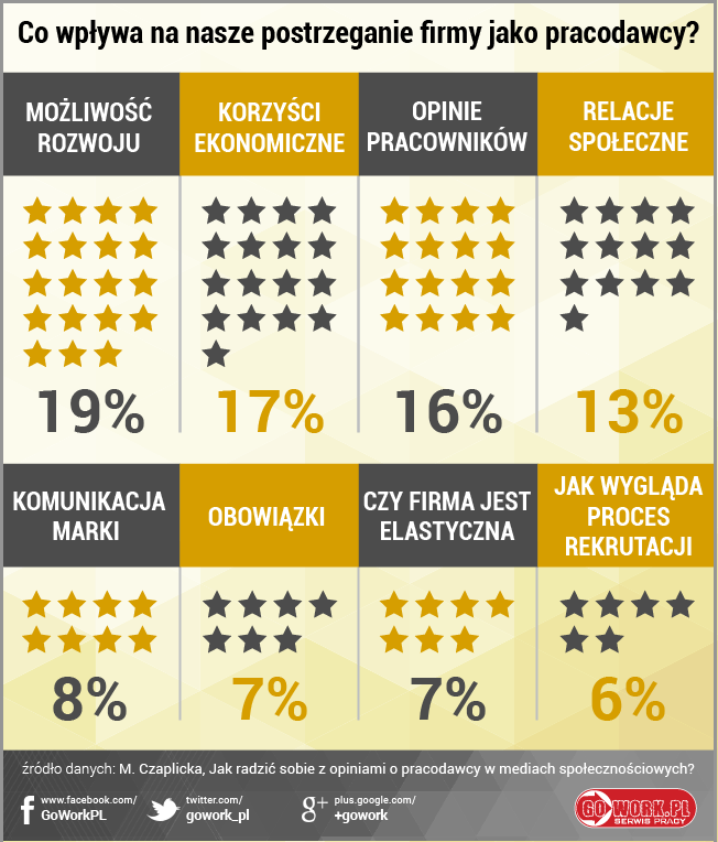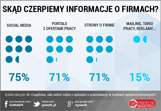 Oprócz opinii prezentowanych pod adresem stworzonym dla pracodawcy, może on publikować na bieżąco aktualne informacje z życia swojej firmy, zwłaszcza o działaniach związanych ze wspieraniem pracowników. Powinny pojawiać się tam relacje z wyjazdów integracyjnych, pikników rodzinnych, czy obecności pracodawcy i jego pracowników na targach branżowych. To bardzo istotne, zważywszy, że to Internet jest najczęstszym źródłem informacji o firmie.
