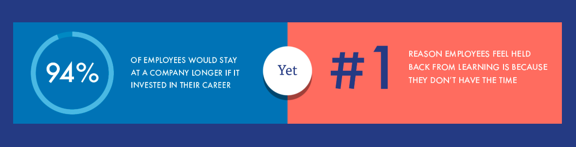 - Czy pracownicy są świadomi ścieżki rozwoju w ramach swoich pozycji? Learning & Development to bardzo ważny obszar rozwoju organizacji – 94% pracowników chce rozwijać się w ramach swojej pracy, jednocześnie powodem nr 1 rezygnowania z tej możliwości jest brak czasu.