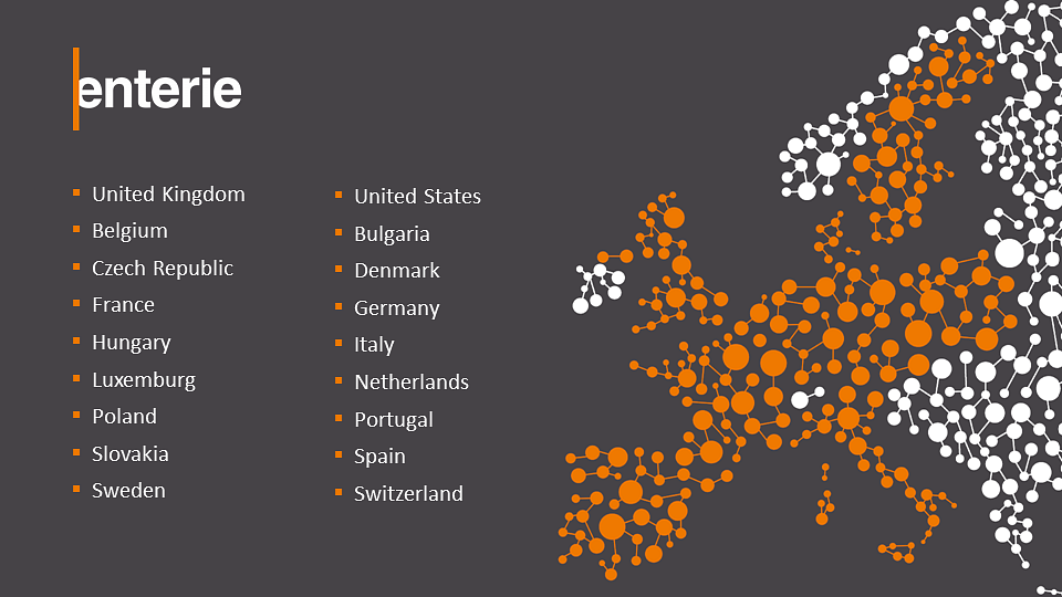Enterie jest obecna w Stanach Zjednoczonych oraz 17 krajach europejskich: w Belgii, Bułgarii, Czechach, Danii, Francji, Hiszpanii, Holandii, Luksemburgu, Niemczech, Polsce, Portugalii, Słowacji, Szwajcarii, Szwecji, Węgrzech, Włoszech i Wielkiej Brytanii.