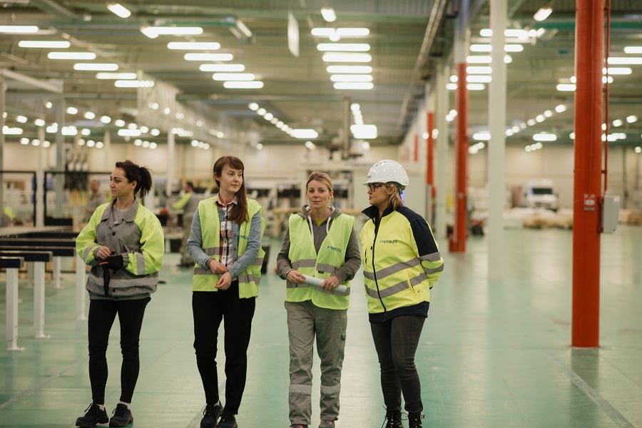 Agnieszka Głowacka (po prawej), prezeska Grupy ERBUD wraz z pracownicami fabryki domów modułowych z drewna.
