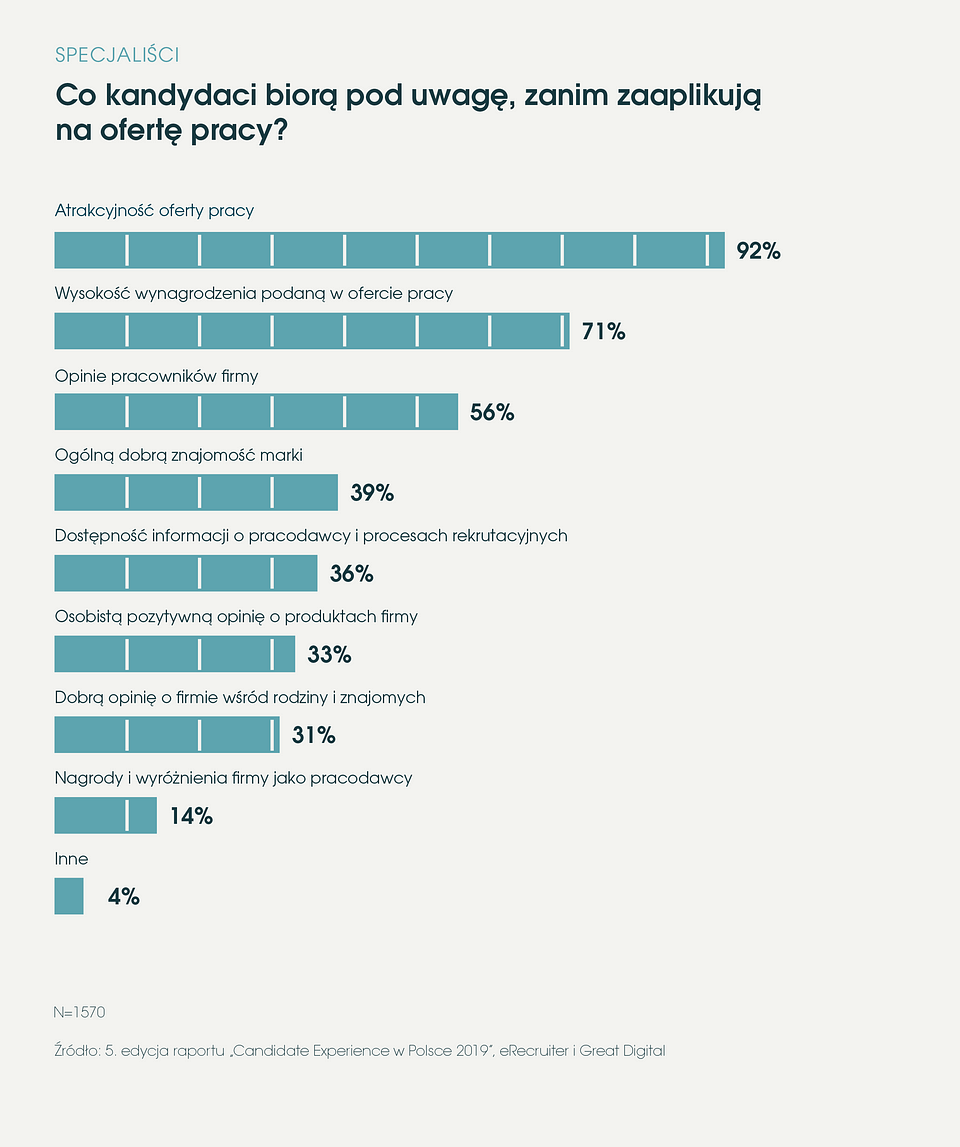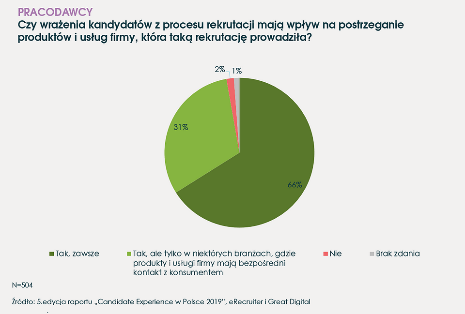 Raport „Candidate Experince” autorstwa eRecruiter dowodzi, że marka pracodawcy oraz marka produktu są ze sobą coraz częściej ściśle powiązane. Z jednej strony co piąty kandydat badany przez eRecruiter, który odniósł negatywne wrażenia podczas rekrutacji do danej firmy, zrezygnuje z zakupu jej produktów i usług. Z drugiej – o zaaplikowaniu przez specjalistów na ofertę pracy często decyduje dobra znajomość marki (39% badanych) czy pozytywna opinia o produktach firmy (33%).