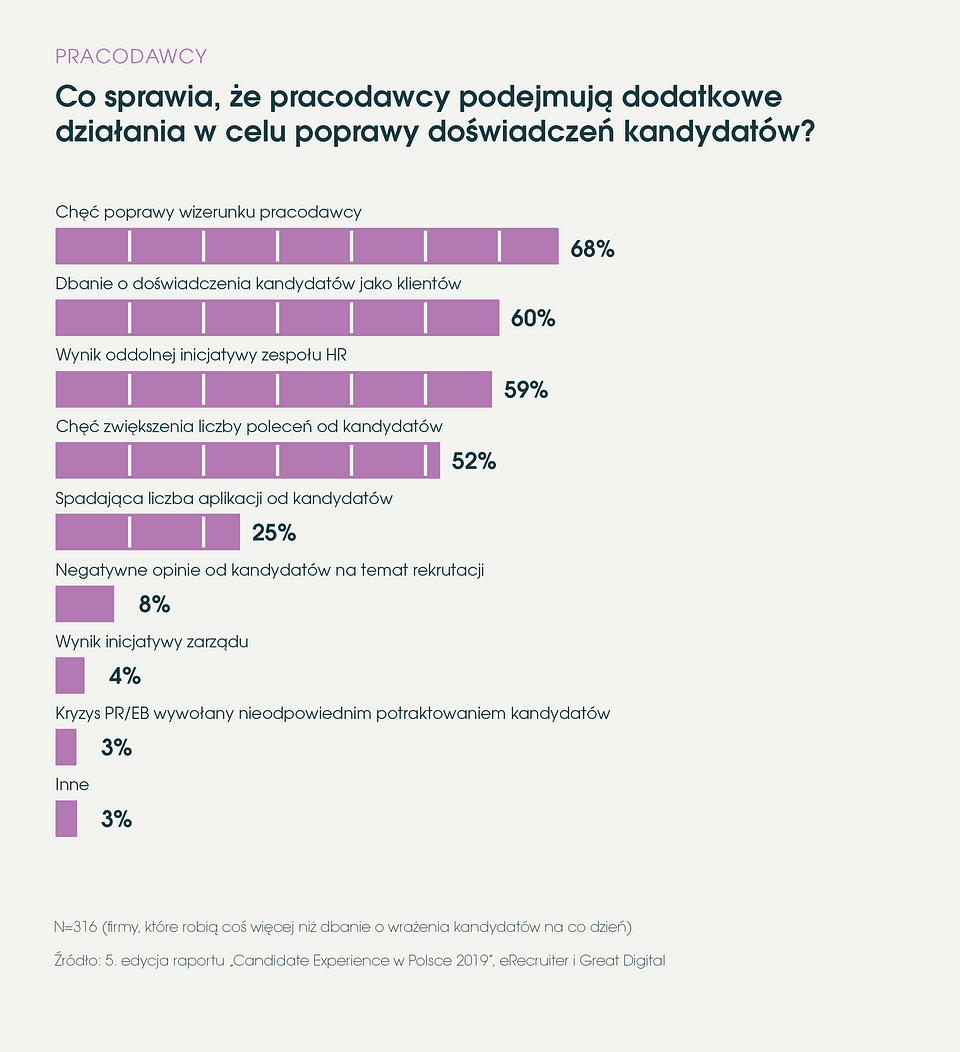 Rosnąca świadomość wpływu działań rekruterów na uczucia, jakie budzi dana marka wśród konsumentów, odzwierciedla się w działaniach firm. Spośród pracodawców, którzy podjęli dodatkowe inicjatywy w obszarze candidate experience, aż 60% zdecydowało się na nie ze względu na podwójną rolę odgrywaną przez rekrutowanych. Są oni dla firmy jednocześnie kandydatami i potencjalnymi klientami.