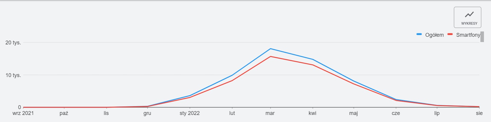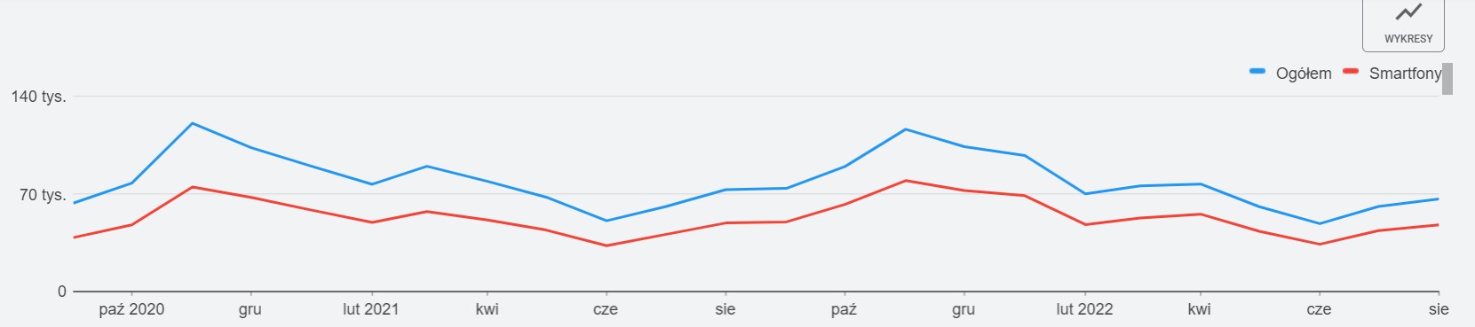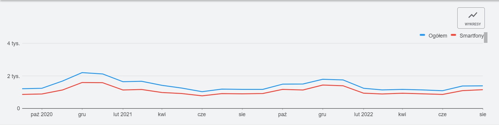 Największą sezonowością będą charakteryzować się tematy ściśle powiązane z datą lub wydarzeniem. Przykładowo, fraza „stylizacje wiosna 2022” notuje ruch jedynie w okresie wiosennym w 2022 roku. W tym konkretnym momencie może być sposobem na przyciągnięcie odbiorców, jednak taki content szybko przestanie być aktualny i będzie potrzebował aktualizacji. Potrzebuje on więc wsparcia w postaci innych tekstów blogowych, utrzymujących zainteresowanie przez cały rok.