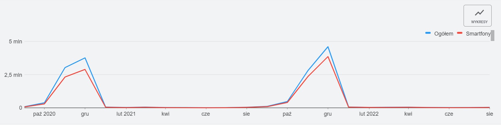 Potencjał drzemiący w sezonowych treściach można zaobserwować m.in. na podstawie Świąt Bożego Narodzenia. Fraza “prezenty na święta” w okresie od stycznia do lipca notuje spadki zainteresowania. Im bliżej okresu świątecznego, tym pojawia się więcej wyszukiwań. W szczytowych punktach, miesięczna liczba wyszukiwań wspomnianej frazy to 3 759 980 w grudniu 2020 i 4 602 520 w grudniu 2021.