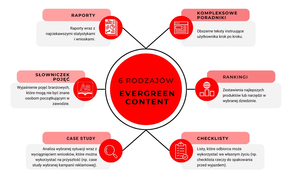 Są rodzaje treści, które mają największą szansę na to, by cieszyć się popularnością przez lata. Dobrymi przykładami evergreen contentu są: