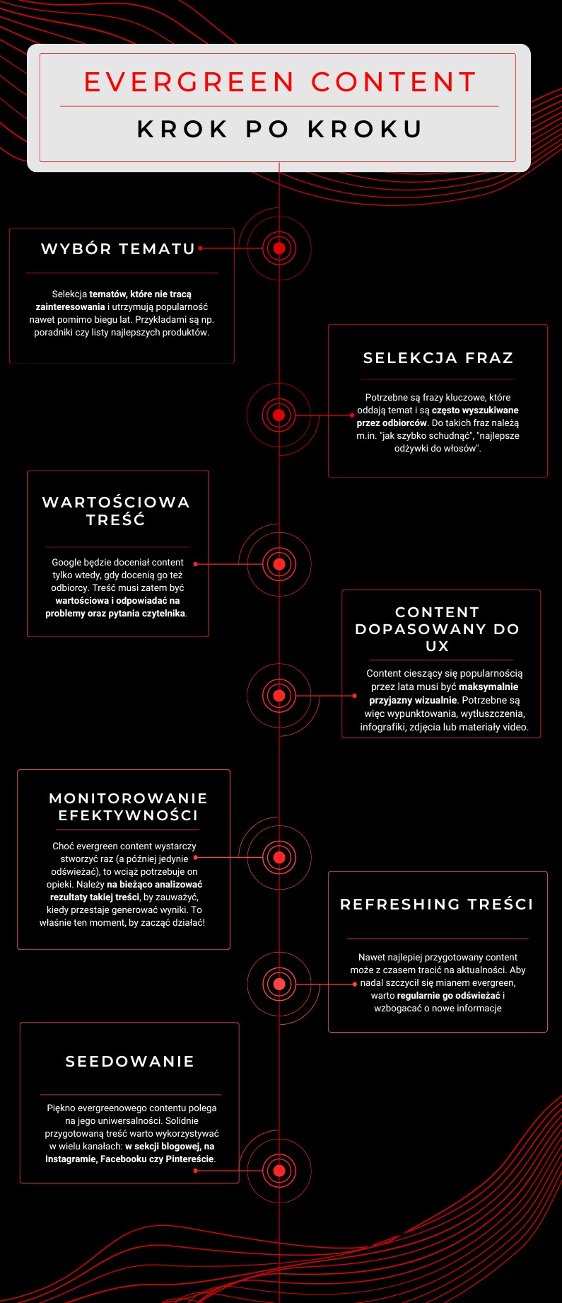 Jakie jeszcze są zalety evergreen content? Kompleksowe, przydatne artykuły, które się nie starzeją, to prawdziwa kopalnia złota. Można wyłonić z nich dziesiątki cennych fragmentów, a następnie udostępniać w lekko zmienionej formie na innych kanałach komunikacji. Intrygujące elementy tekstu warto np. przedstawić w postaci infografiki i wykorzystać ją w mediach zewnętrznych, raportach, podsumowaniach czy raportach. W ten sposób evergreen content oszczędza czas – eliminujemy konieczność kolejnego researchu tematu i w pełni czerpiemy z tego, co raz przygotowaliśmy.